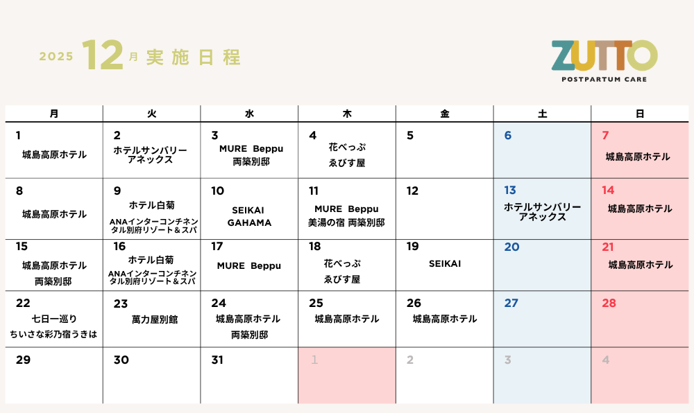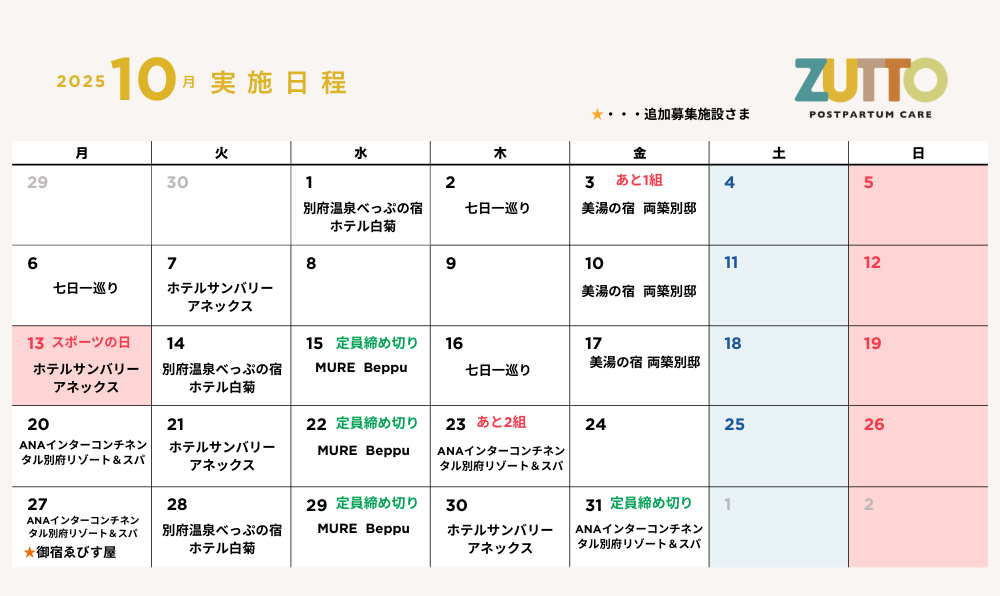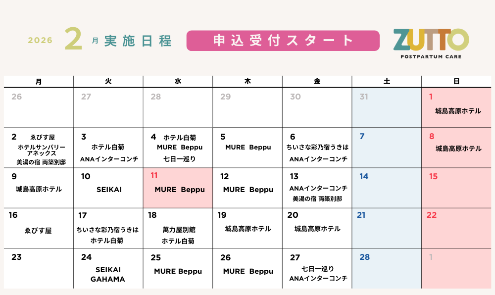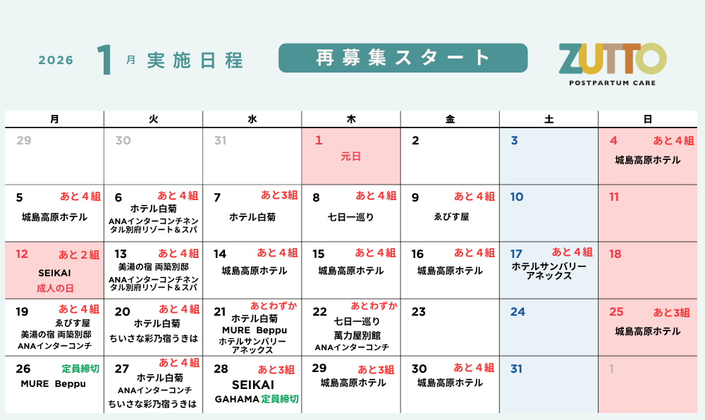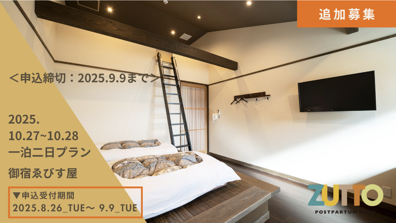 トピックスTOPICS 2025-12-02 「ZUTTO」で滞在中の特別オプションメニューをご紹介します! 2025-12-01 2月「ZUTTO」第5弾募集スタート! 2025-11-20 ZUTTO <1月実施分> 再募集を開始しました! 2025-11-01 ZUTTO 申し込み方法 2025-11-01 1月「ZUTTO」第4弾募集スタート! 2025-10-30 12月受付中~確定まであとわずかの施設紹介~ 2025-10-25 12月受付中~確定まであとわずかの施設紹介~ 2025-10-01 12月「ZUTTO」第3弾募集スタート! 2025-09-30 【再募集中】11月実施分の再募集を行っています。 2025-08-27 【追加募集】「ZUTTO」御宿ゑびす屋 さま、10月 利用者募集中です! 2025-08-26 【再募集!】10月実施分の再募集開始 2025-08-04 【追加募集】「ZUTTO」両築別邸 さま、9月・10月 利用者募集中です! 2025-07-23 ZUTTO公式LINE 友だち募集中! 2025-07-21 10月「ZUTTO」実施カレンダー 2025-07-21 9月「ZUTTO」実施カレンダー 2025-07-20 「ZUTTO」利用者を7/21(月)より募集します!(9月・10月実施分) 2025-06-25 7月1日(火)より令和7年度の情報が公開されます 2024-12-15 ZUTTO 2月実施スケジュール 2024-12-15 「ZUTTO」第2弾申込み受付を12/16(月)より開始します! 2024-11-21 ZUTTO 1月実施スケジュール 2024-11-19 よくある質問
