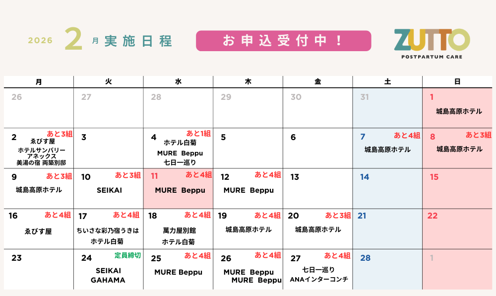 トピックスTOPICS ZUTTO MOTTO 2026-03-01 別府ウェルネス産後ケアサービスZUTTOとは 2025-12-26 ZUTTO<第5弾>再募集受付中!! 2025-12-02 「ZUTTO」で滞在中の特別オプションメニューをご紹介します! 2025-12-01 2月「ZUTTO」第5弾募集スタート! 2025-11-20 ZUTTO <1月実施分> 再募集を開始しました! 2025-11-01 ZUTTO 申し込み方法 2025-11-01 1月「ZUTTO」第4弾募集スタート! 2025-10-30 12月受付中~確定まであとわずかの施設紹介~ 2025-10-25 12月受付中~確定まであとわずかの施設紹介~ 2025-10-01 12月「ZUTTO」第3弾募集スタート! 2025-09-30 【再募集中】11月実施分の再募集を行っています。 2025-08-27 【追加募集】「ZUTTO」御宿ゑびす屋 さま、10月 利用者募集中です! 2025-08-26 【再募集!】10月実施分の再募集開始 2025-08-04 【追加募集】「ZUTTO」両築別邸 さま、9月・10月 利用者募集中です! 2025-07-23 ZUTTO公式LINE 友だち募集中! 2025-07-21 10月「ZUTTO」実施カレンダー 2025-07-21 9月「ZUTTO」実施カレンダー 2025-07-20 「ZUTTO」利用者を7/21(月)より募集します!(9月・10月実施分) 2025-06-25 7月1日(火)より令和7年度の情報が公開されます 2024-12-15 ZUTTO 2月実施スケジュール 2024-12-15 「ZUTTO」第2弾申込み受付を12/16(月)より開始します! 2024-11-21 ZUTTO 1月実施スケジュール 2024-11-19 よくある質問 2026-03-01 別府ウェルネス産後ケアサービスMOTTOとは 2025-09-29 「MOTTO」で滞在中の特別オプションメニューをご紹介します! 2025-09-29 産後ケアとウェルネスを届ける「MOTTO」始動!